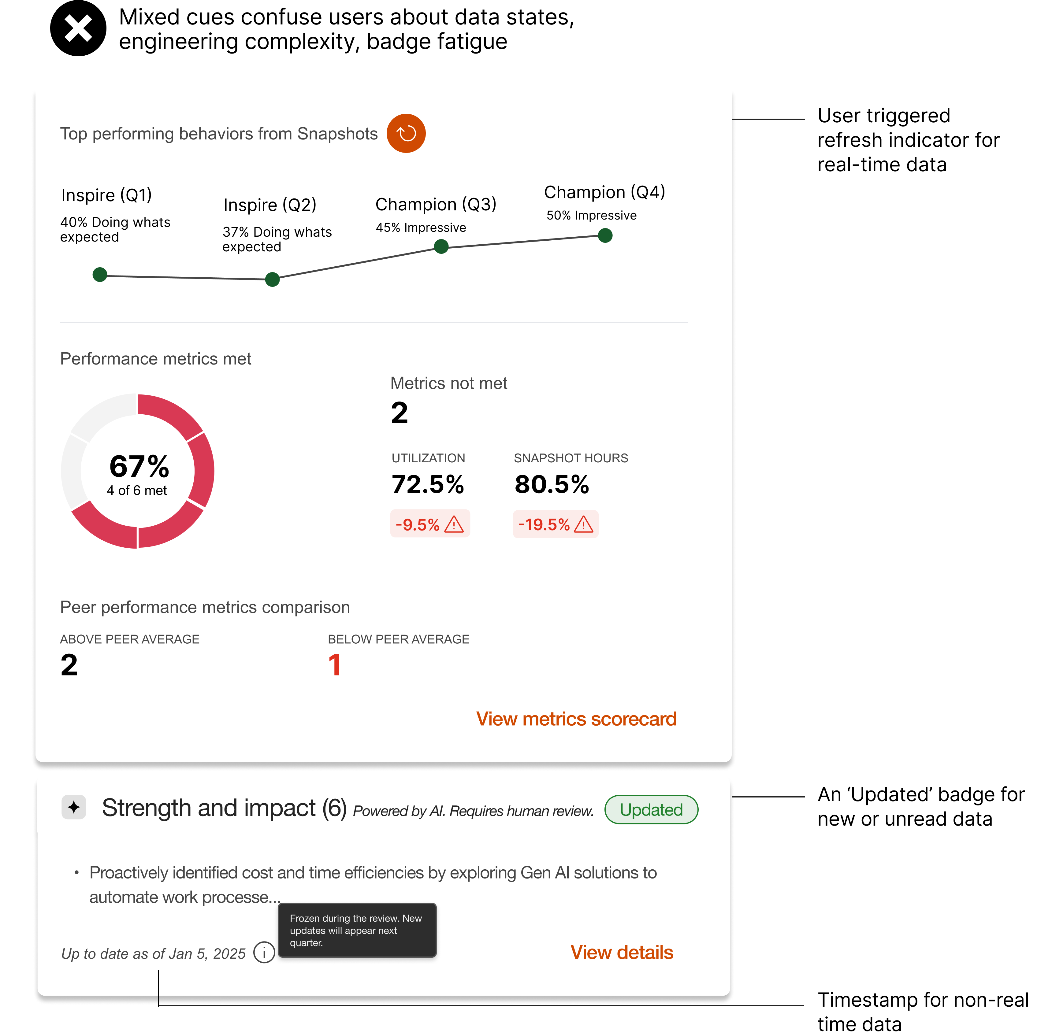 Inconsistent timestamps across sections create uncertainty about data recency which undermines trust and fairness.